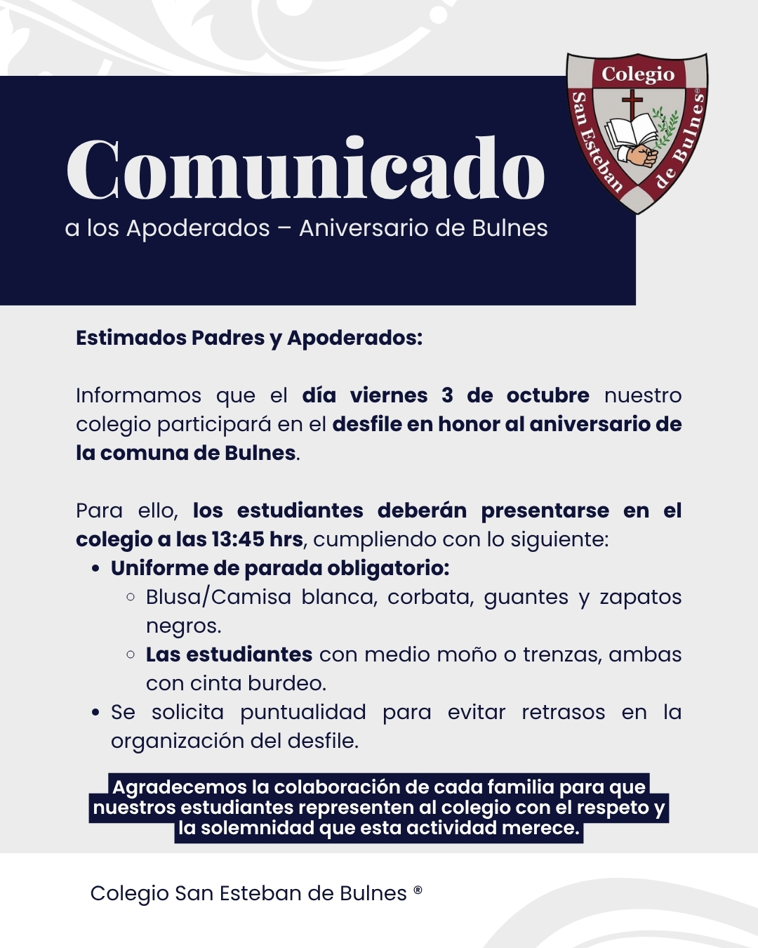 Estimados padres, madres y apoderados: Les escribo para recordarles lo establecido en nuestro RICE (Reglamento Interno de Convivencia Escolar) en cuanto a la OBLIGACIÓN en el uso del uniforme escolar para el año 2025.